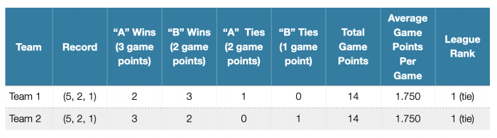Example #2 below is with the same teams. Both Team 1 and Team 2 played the same number of games and have the same record. However in this example, Team 1 had a tie against an “A” team, rather than a A Team as in the previous example. A tie against an “A” team gave them an extra game point for that game, bringing their total game points to 14. This is the same total game points that Team 2 received, and because they played the same number of games in the season, their average game points per game is the same, 1.75. This means that they are tied for the same NFHL rank, and their final ranking will be determined by tiebreakers (average goal differential, etc.). The details on the order of tiebreakers can be found below.